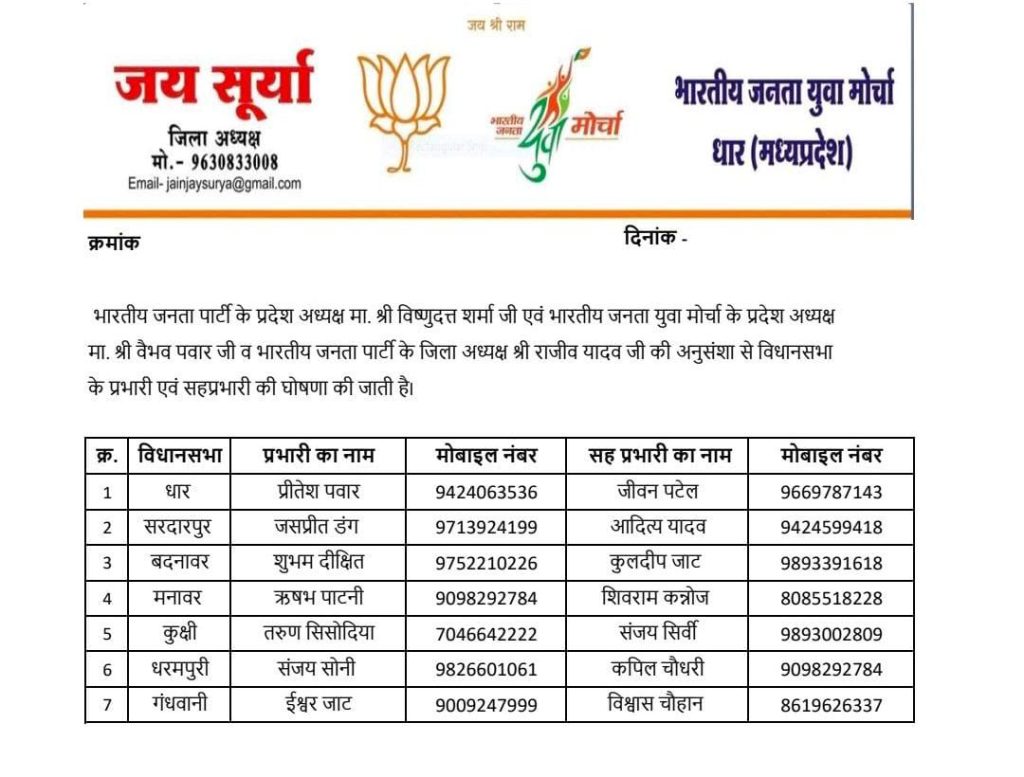 : विधानसभा चुनाव के लिये भाजयुमो ने की प्रभारीयो की नियुक्ति ,युवा नेता दिक्षीत को बदनावर,जसप्रीत डंग को बनाया सरदारपुर का प्रभारी