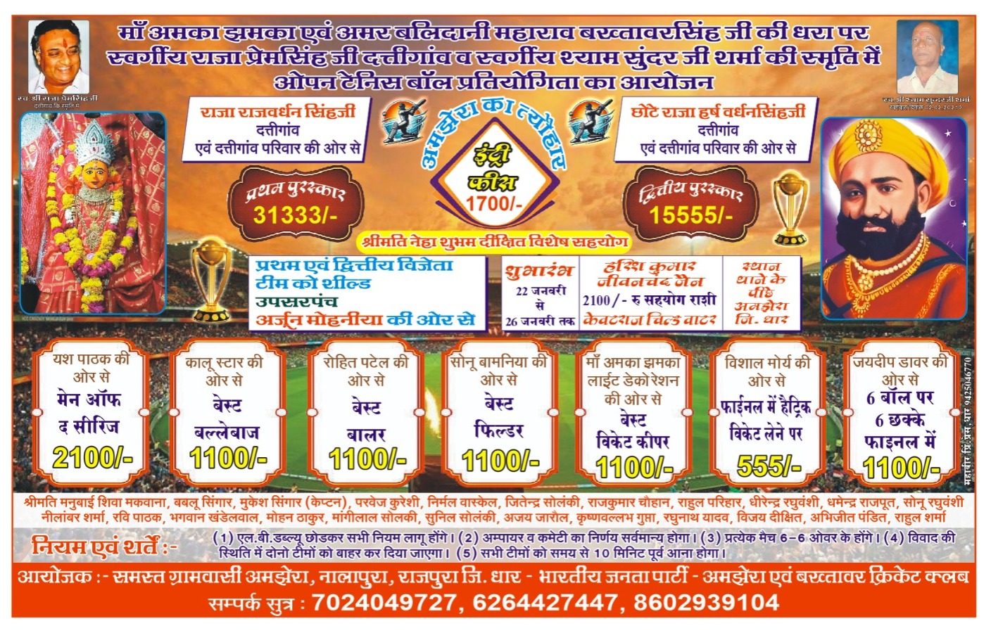 : ओपन टेनिस बाल क्रिकेट टूर्नामेंट का आयोजन कल से अमझेरा का त्यौहार तैयारी मे जुटे कमेटी के सदस्य