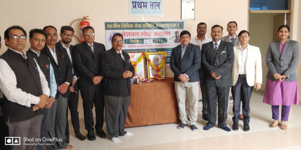 सरदारपुर। न्यायालय परिसर में लोक अदालत का आयोजन हुआ । लोक अदालत मे राजीनामा के माध्यम से कइ प्रकरणों का निराकरण हुआ। लोक अदालत का शुभारंभ प्रभारी न्यायाधीश अतिरिक्त जिला एवं सत्र न्यायाधीश निरंजन कुमार पांचाल ने शुभारंभ किया इस अवसर पर अतिरिक्त जिला एवं सत्र न्यायाधीश राधाकिशन मालवीय पारस कुमार जैन व्यवहार न्यायाधीश प्रथम श्रेणी श्रीमती प्रियंका मालपानी राठी। न्यायिक दंडाधिकारी प्रथम श्रेणी भूपेन्द्र यादव महेन्द्र सिंह मेहसन अभिभाषक संघ अध्यक्ष बीजे उपाध्याय सचिव कमल किशोर वैष्णव वरिष्ठ अभिभाषक रामलाल पाटिल दिग्विजय सिंह मनीष सिसोदिय भूपेंद्र जोशी दिलीप भदोरिया वीरेंद्र राठौर सचिन बैरागी ओसाफ अहमद खान अनिल यादव योगेंद्र उपाध्याय आदि अभिभाषक उपस्थित रहे ।