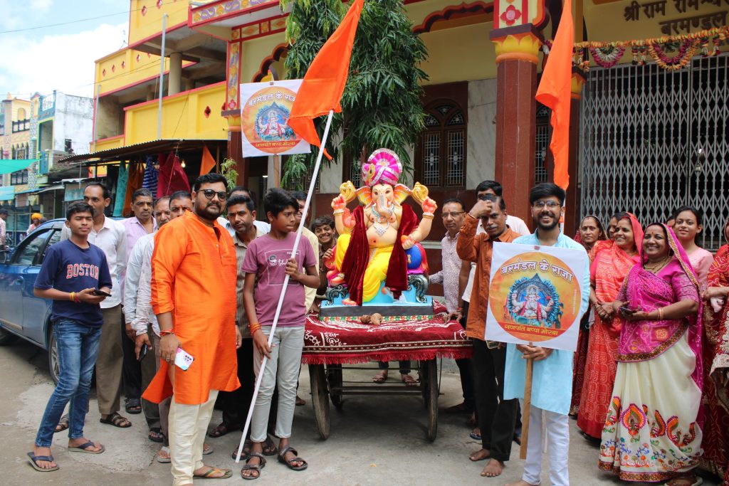 बरमंडल। दस दिवसीय गणेश उत्सव का आज श्रद्धा एंव उत्साह के साथ आगाज हो गया। शुभ मुहर्त मे घर-घर बप्पा की स्थापन्ना कर आरती की गई। सदर बाजार मे अंबिका माता मंदिर (बडे अंबाजी) पर बरमंडल के राजा का दरबार सजाया गया । श्री राम रामेश्वर धाम से बप्पा की मुर्ति चल समारोह के साथ ढोल ढमाके के साथ लाकर स्थापित की गई।